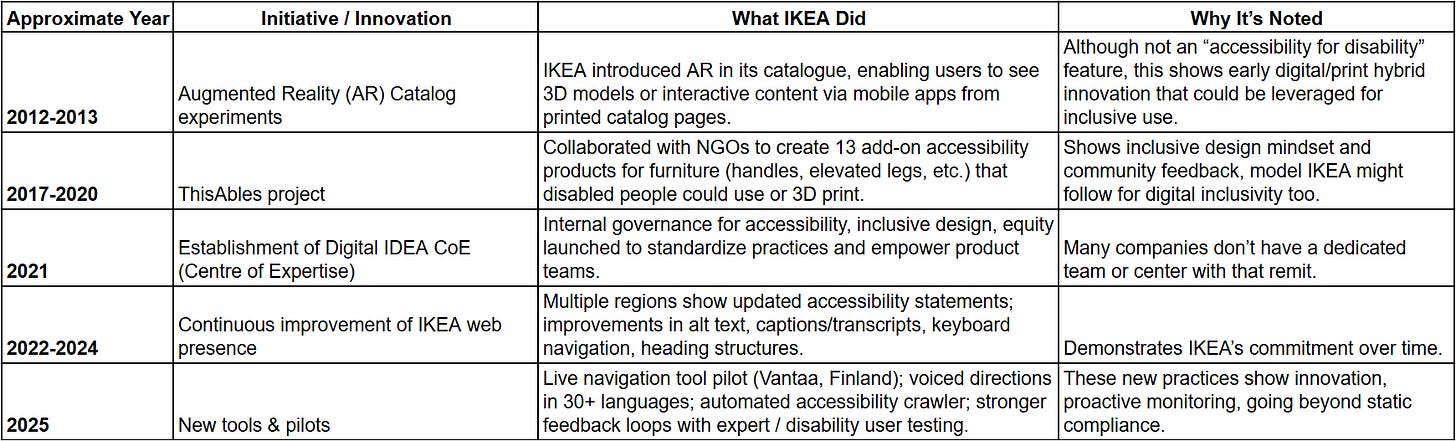 2012–2013: IKEA experiments with digital innovation in its catalogues, adding AR features. Not directly accessibility-focused, but an early sign of blending digital + inclusive design.