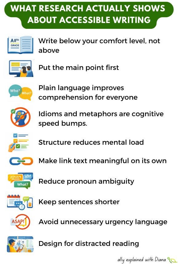 If you write anything online - a blog post, an email, a website copy - your words either reduce friction or create it. Research in readability and cognitive accessibility proves that the way we write can trully expand understanding. Here are some research-backed ways to make your writing more accessible: